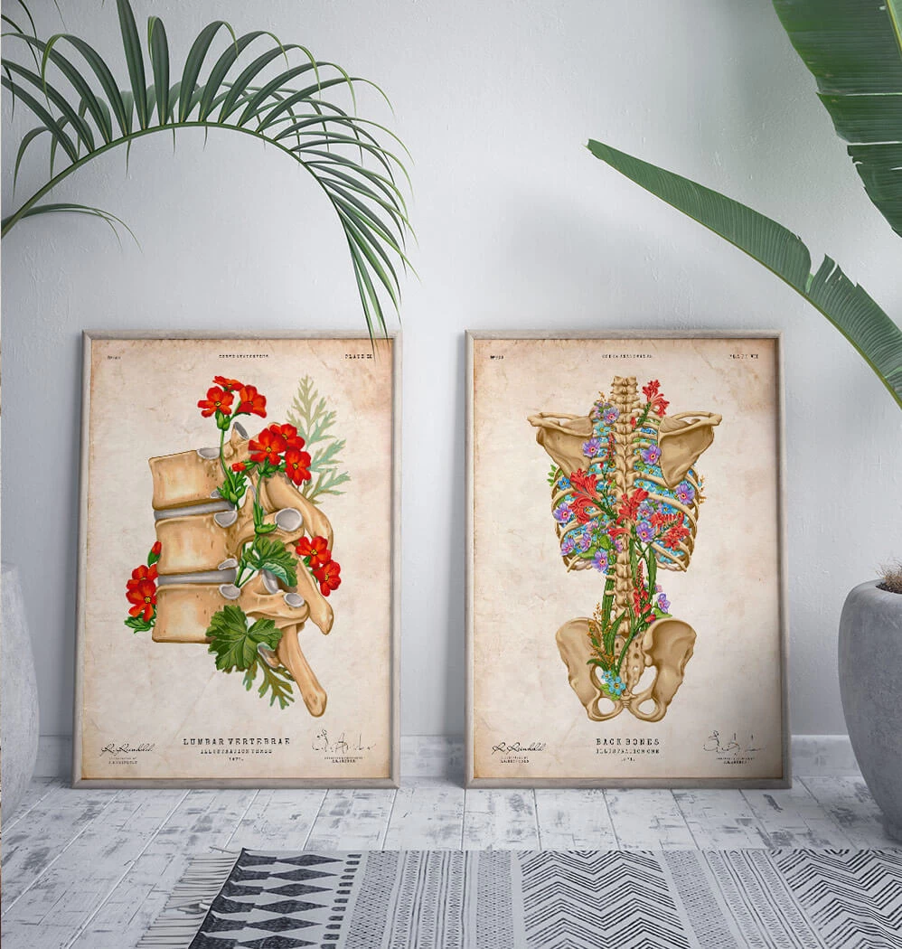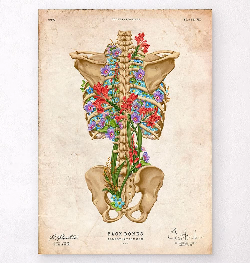 Also available on black and white backgrounds. This back skeleton anatomy art print is a wonderful addition to any interior and will make a perfect gift for doctors, nurses, and medical students.