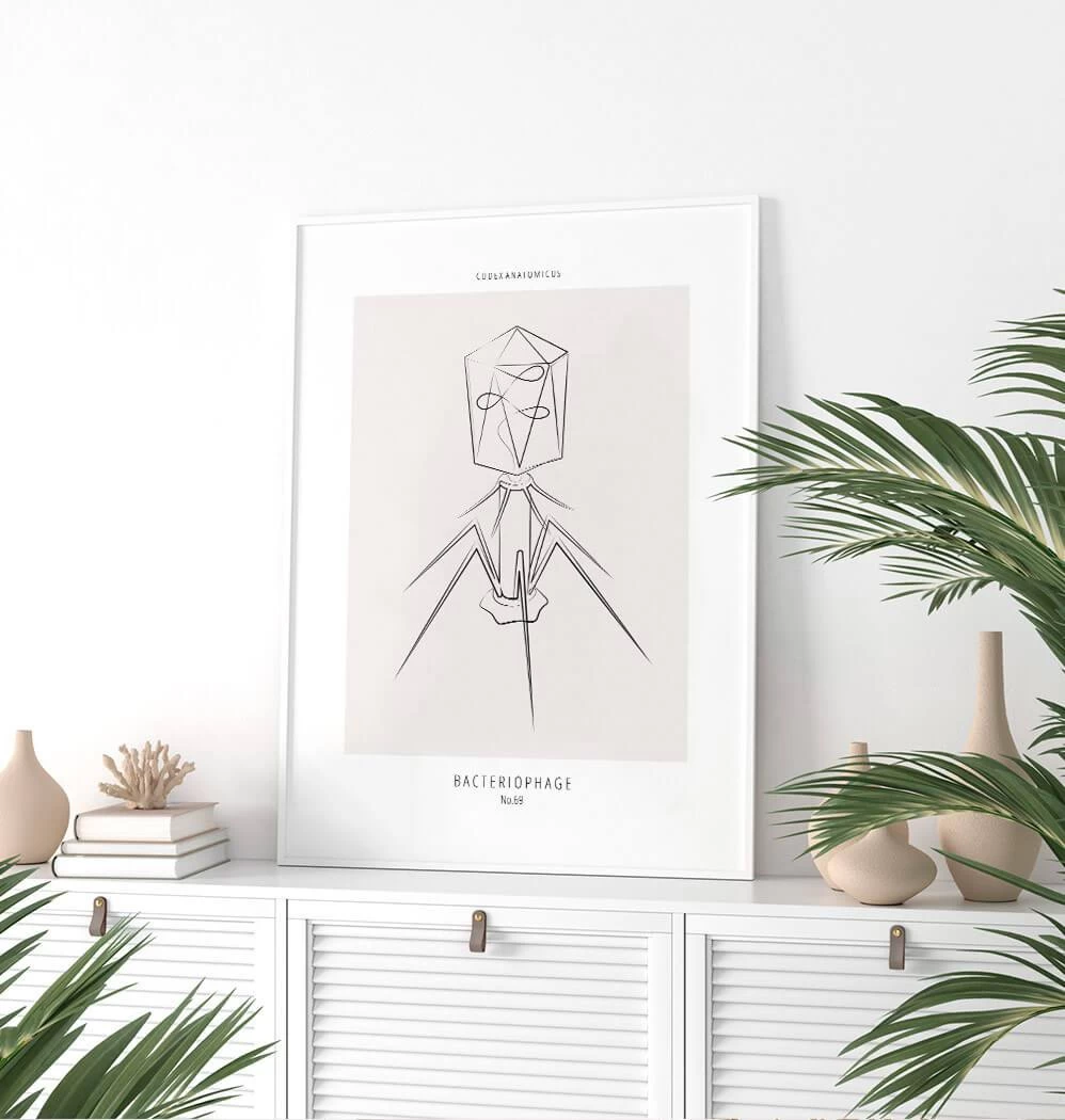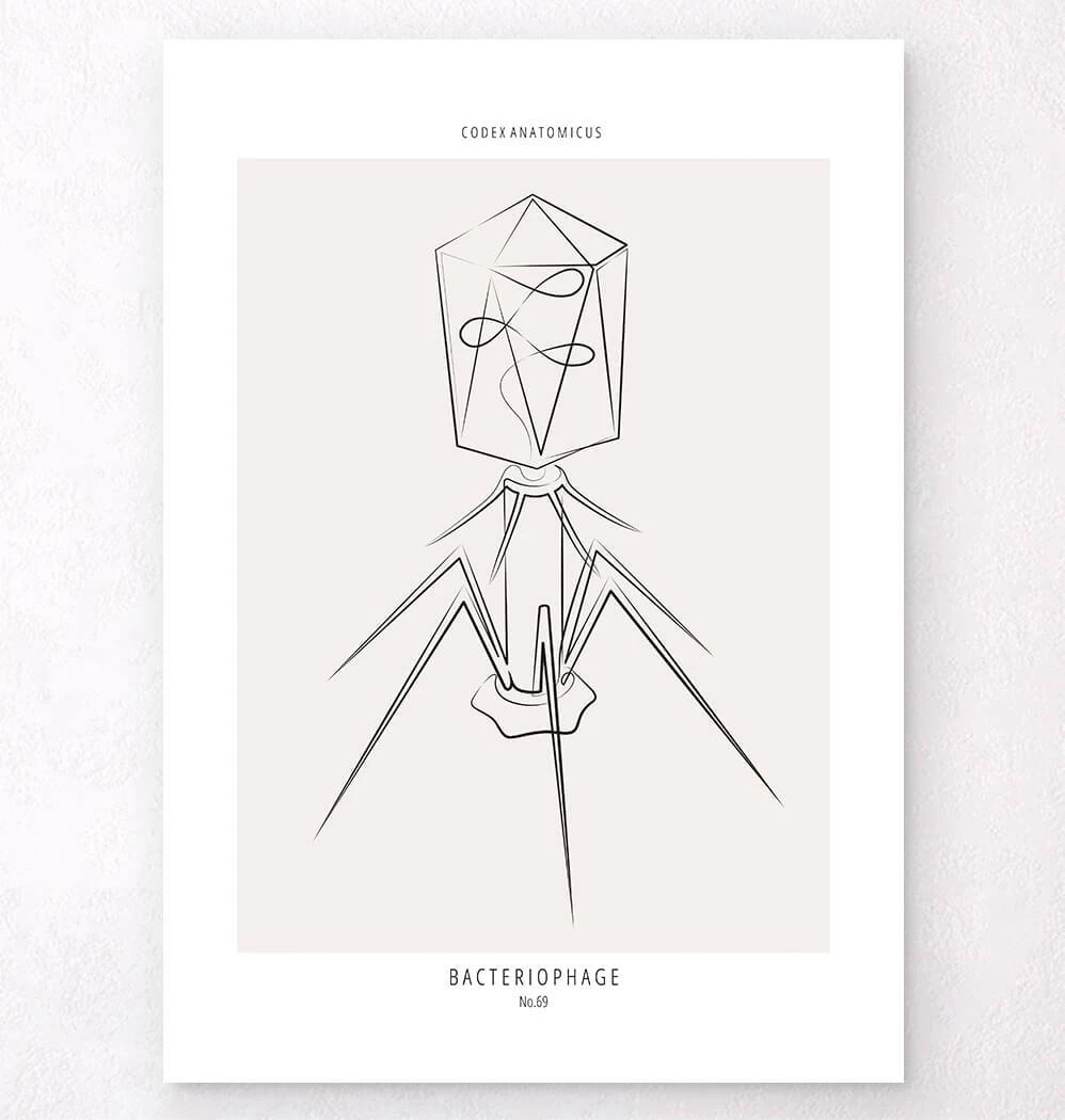 Minimalist line art illustration of a bacteriophage. This premium art print is a wonderful addition to any décor, whether home, clinic or a lab. It’s also a great gift for health workers, medical and biology students.