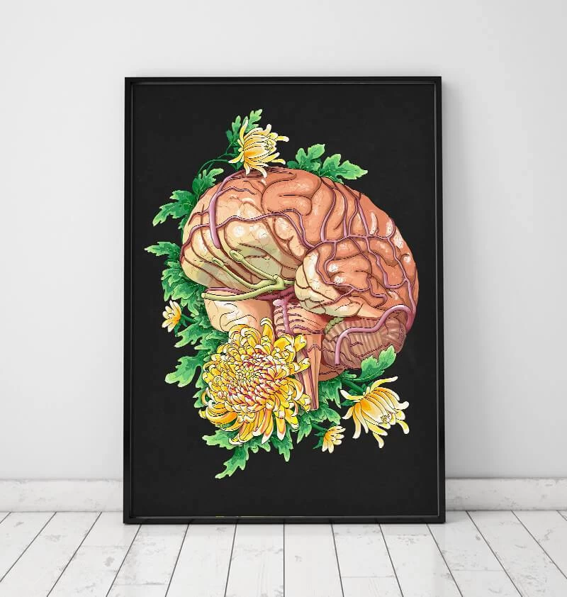 This brain anatomy art print is a wonderful addition to any interior and will make a perfect gift for doctors, nurses and medical students. Also available on white, vintage, and old dictionary backgrounds.