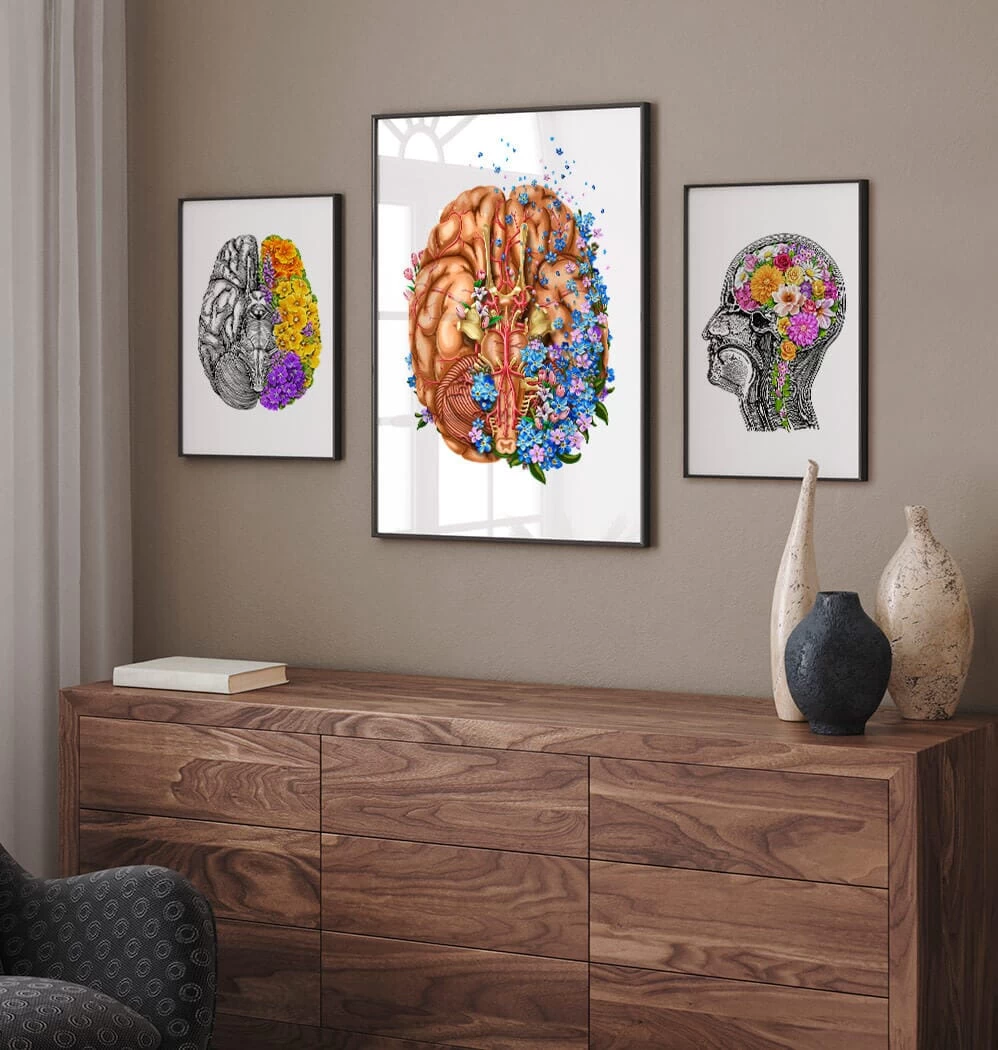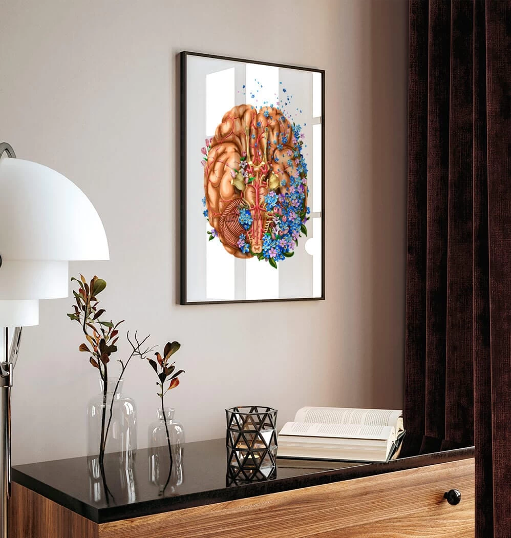 This brain anatomy art print is dedicated to raising awareness about dementia. Surrounding the brain are forget-me-not flowers, which symbolize hope and the aspiration to find a cure. This artwork aims to inspire support and understanding in the fight against this challenging condition.