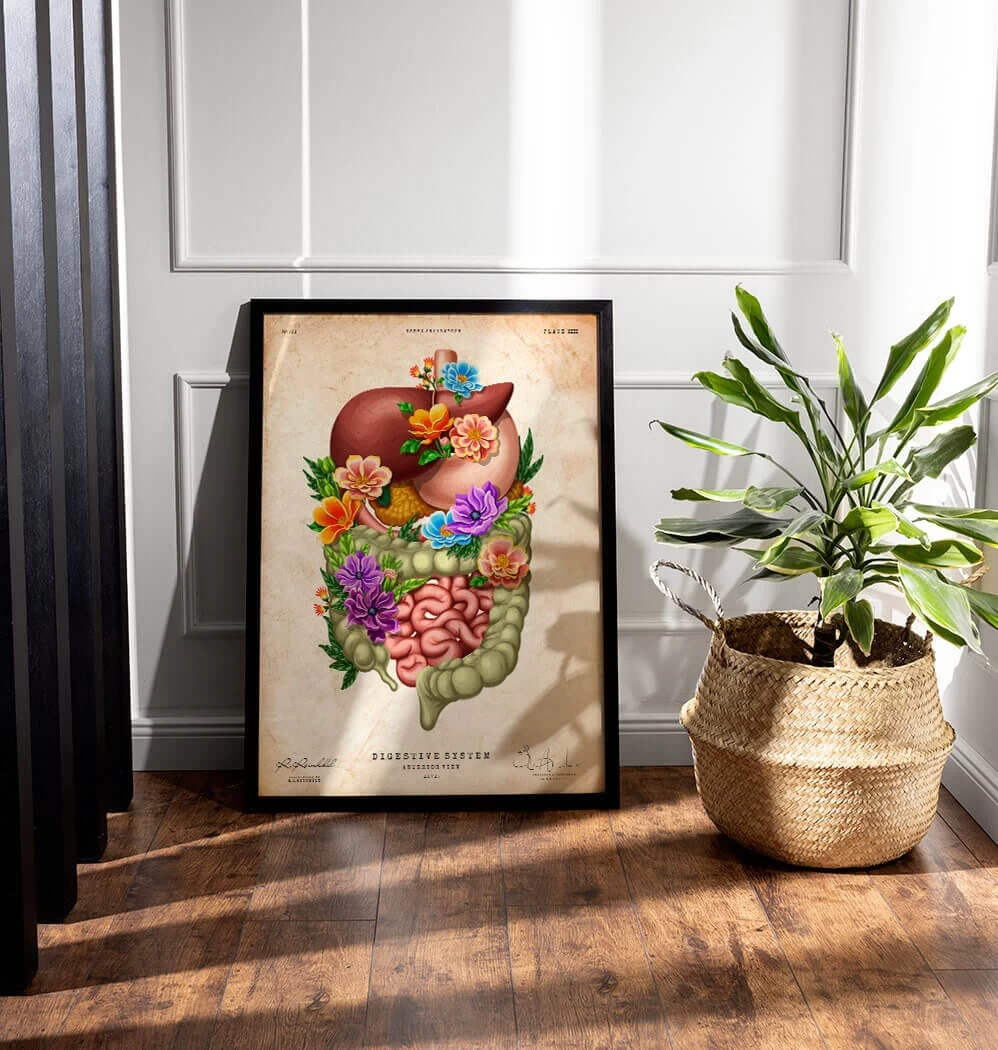 Also available on black and white backgrounds. This digestive system anatomy art print is a wonderful addition to any interior and will make a perfect gift for doctors, nurses, and medical students