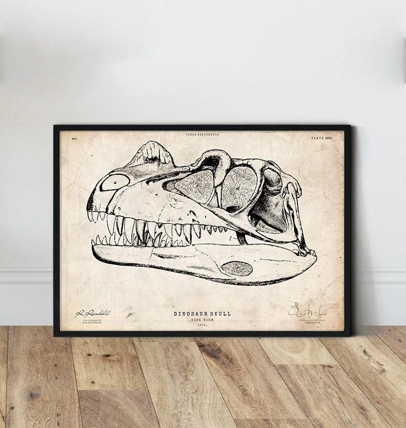 This dinosaur skull anatomy art print is a wonderful addition to any interior and will make a perfect gift for anyone who likes dinosaurs.