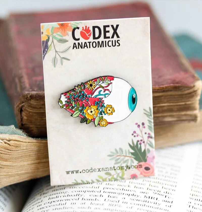 Beautiful enamel pin showing an eye with flowers. Perfect multifunctional accessory that can be worn as a brooch or as decoration for a bag. Has a stamp with Codex Anatomicus logo on the back – great for collecting.