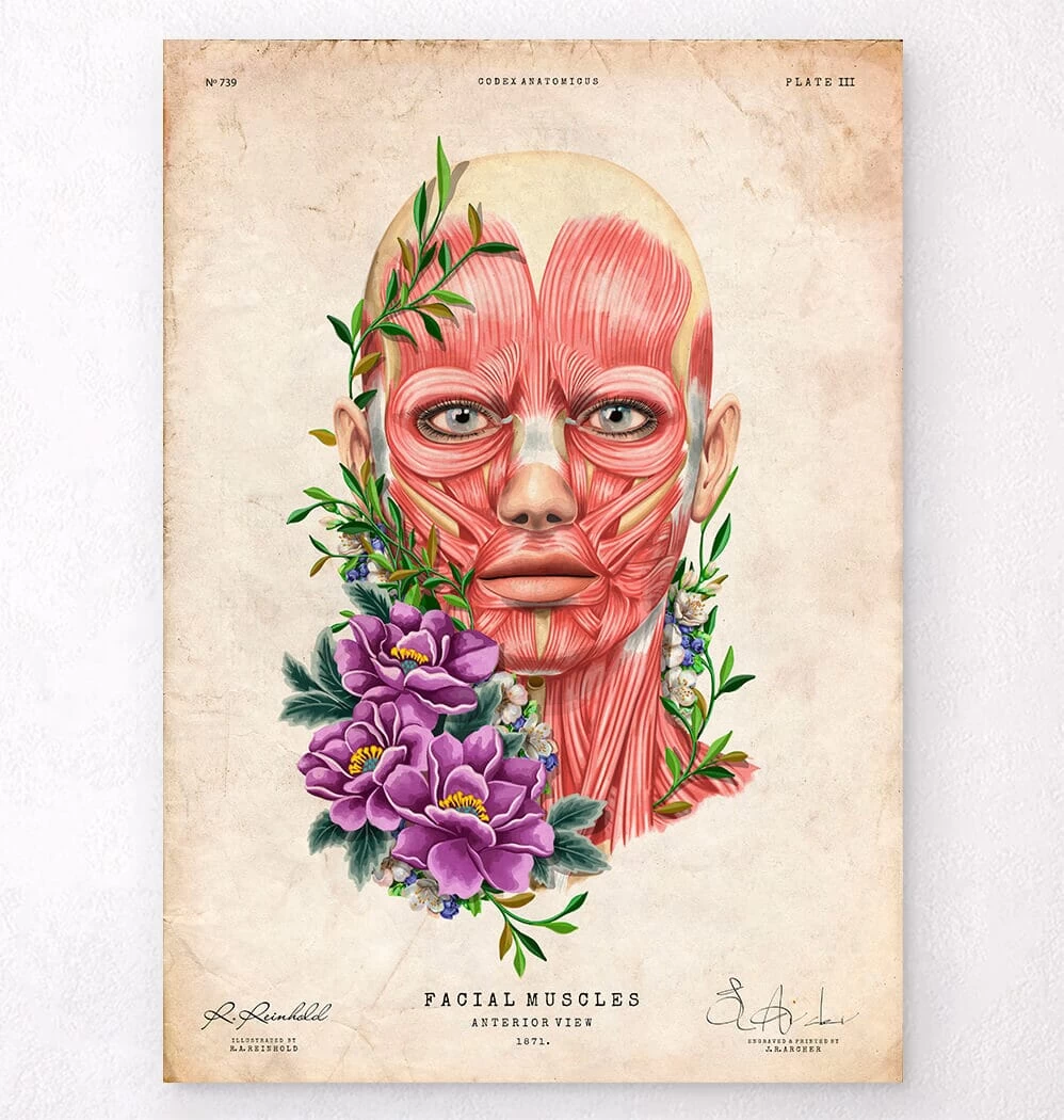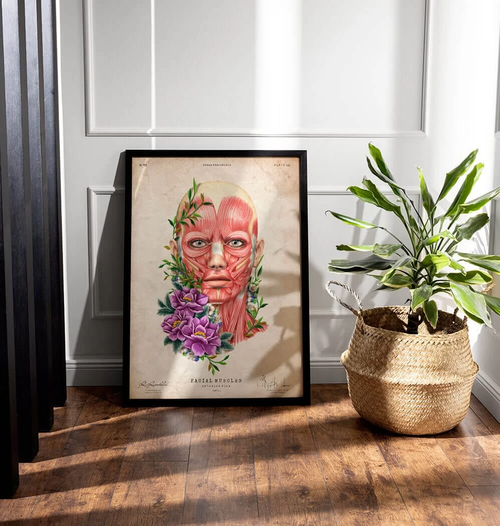Also available on black and white backgrounds. This facial muscles anatomy art print is a wonderful addition to any interior and will make a perfect gift for doctors, nurses, and medical students