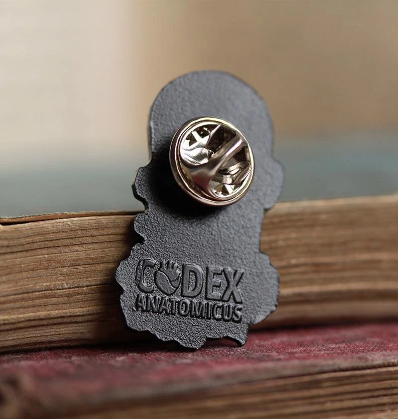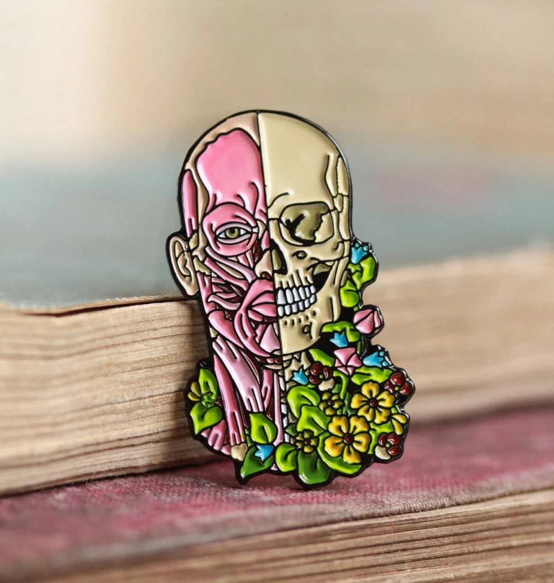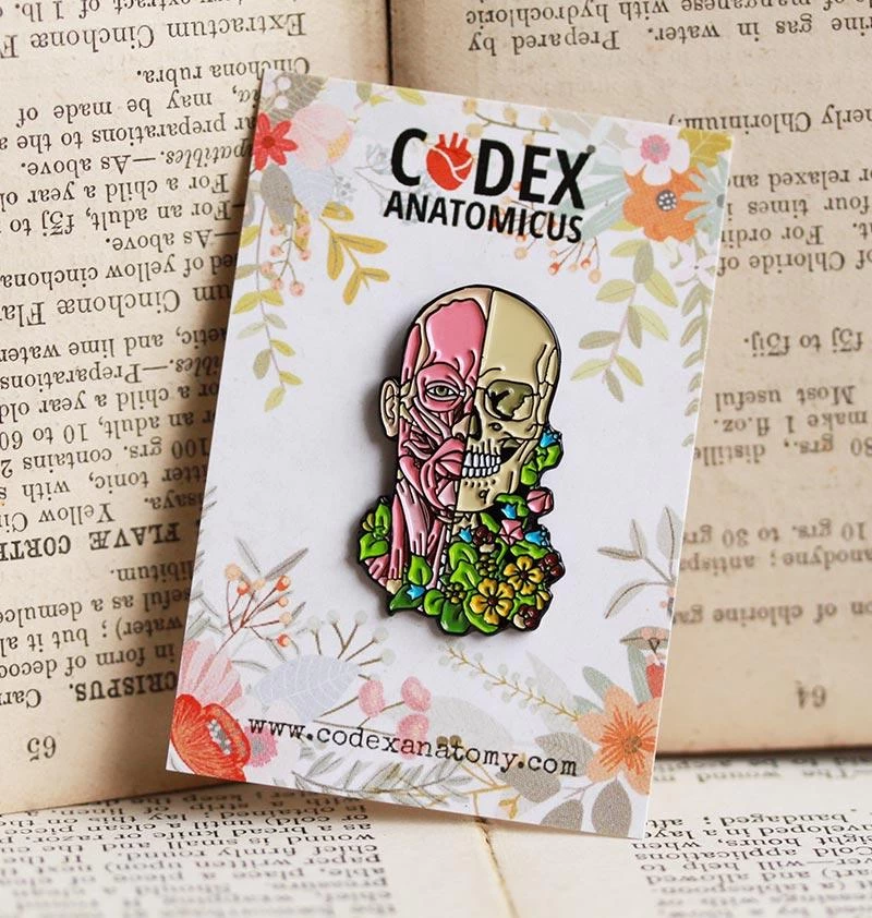 Beautiful enamel pin showing a skull and facial muscles with flowers. Perfect multifunctional accessory that can be worn as a brooch or as decoration for a bag. Has a stamp with Codex Anatomicus logo on the back – great for collecting.