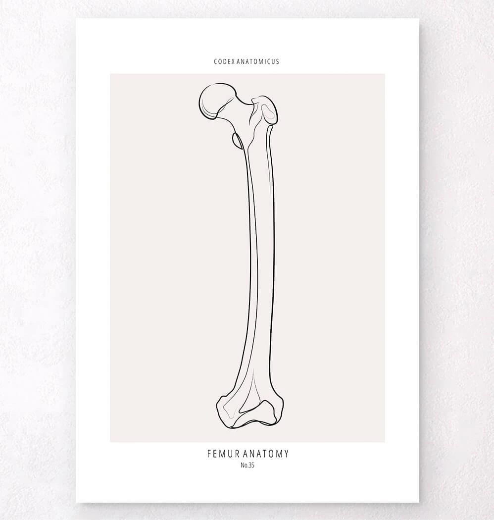 Line art representing the femur – the strongest bone in the human body. This premium art print is a perfect décor piece for a home, chiropractic studio, or physiotherapy room. It’s also a great gift for health workers and medical students.