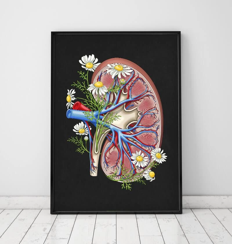 This kidney anatomy art print is a wonderful addition to any interior and will make a perfect gift for doctors, nurses, and medical students. Also available on white, vintage, old dictionary, or white dictionary backgrounds.