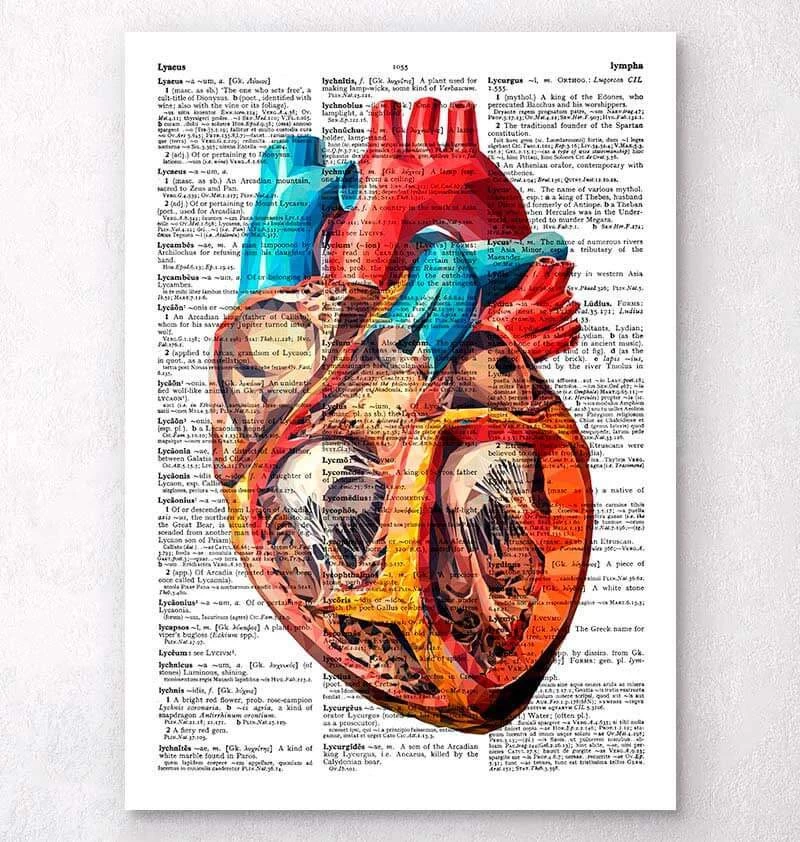 This heart anatomy art print is a wonderful addition to any interior and will make a perfect gift for doctors, nurses and medical students. Also available on plain white and old dictionary page backgrounds.
