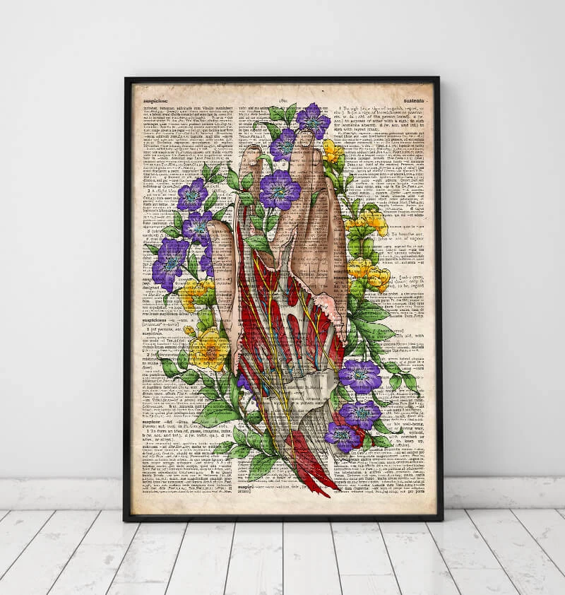 This hand anatomy art print is a wonderful addition to any interior and will make a perfect gift for doctors, nurses, and medical students. Available on black, white, vintage, or white dictionary backgrounds.