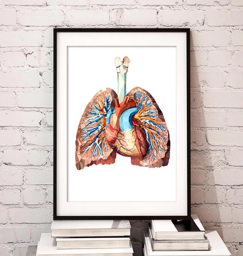 This heart and lungs anatomy art print is a wonderful addition to any interior and will make a perfect gift for doctors, nurses, and medical students. Also available on the old dictionary page background.
