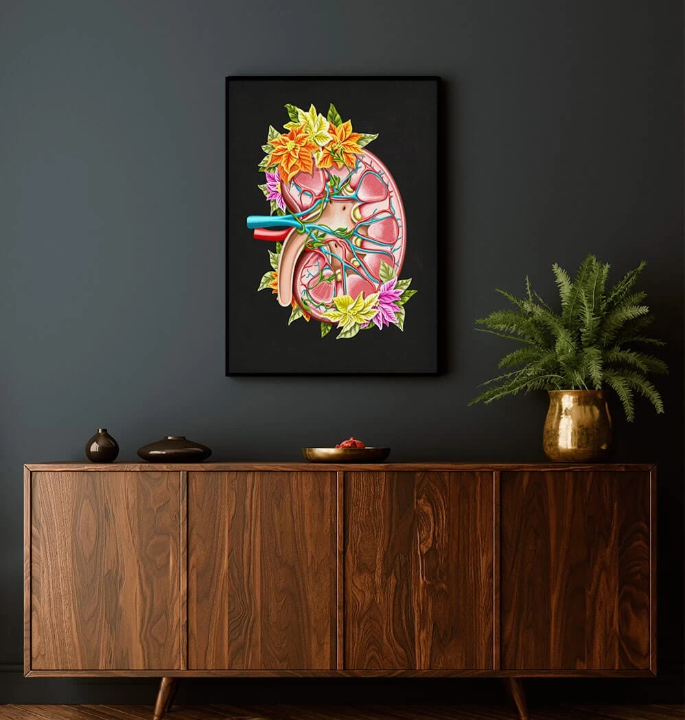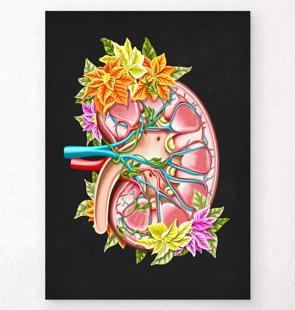Also available on whiteย and vintage backgrounds. This kidney anatomy art printย is a wonderful addition to any interior and will make a perfect gift for doctors, nurses and medical students