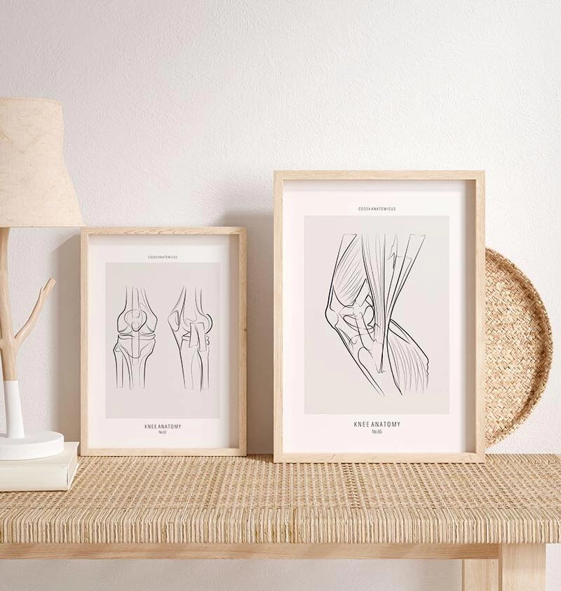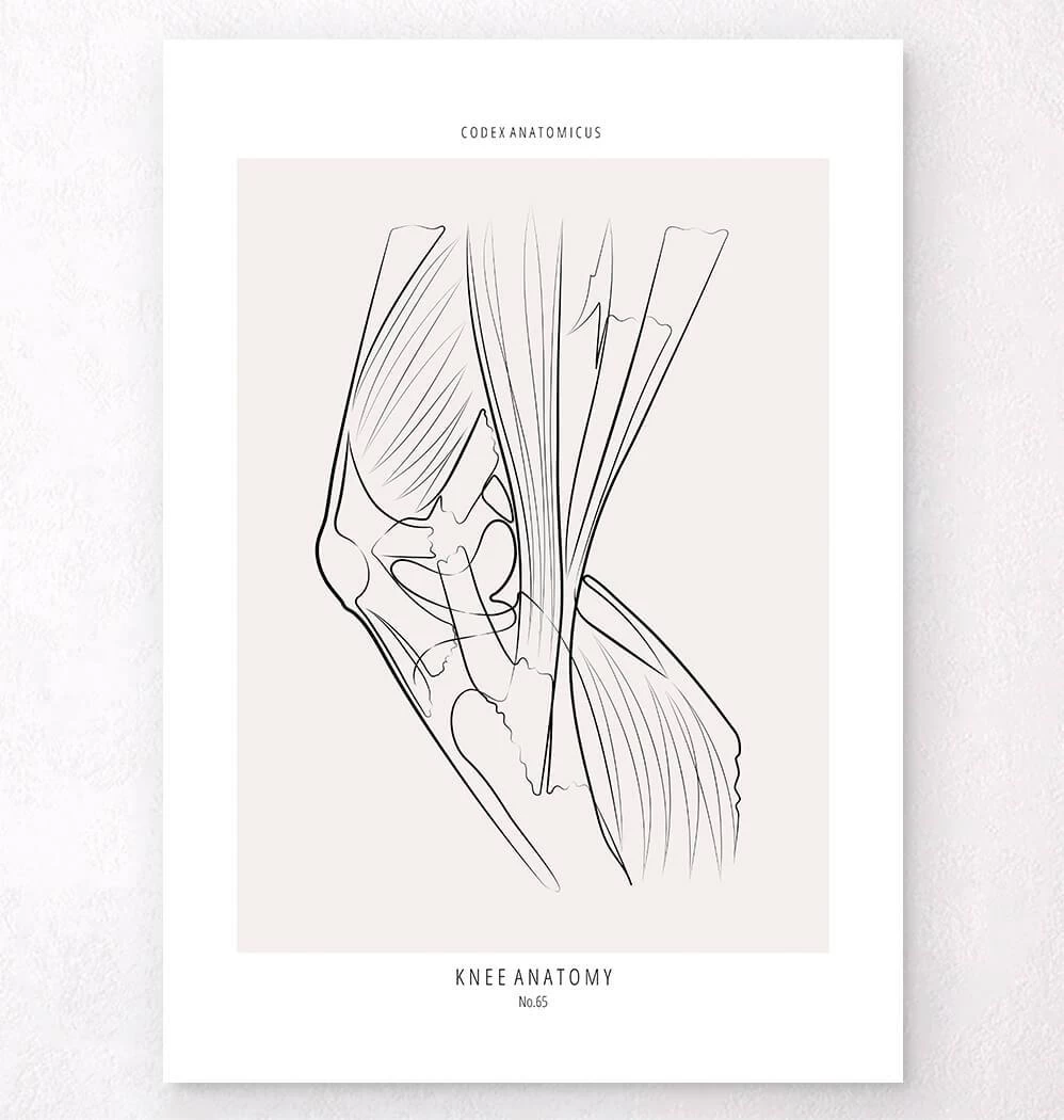 Side view of the knee showing ligaments and muscles in minimalist line art style. This premium art print is a perfect décor piece for a home, chiropractic studio, or physiotherapy room. It’s also a great gift for health workers and medical students.