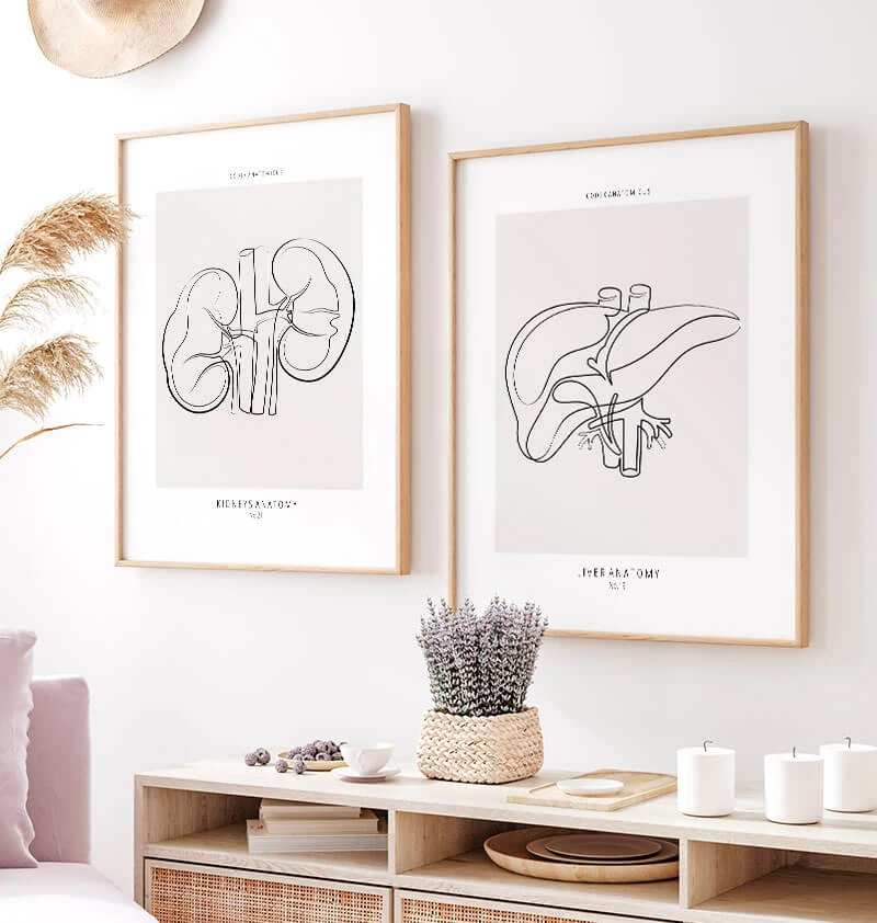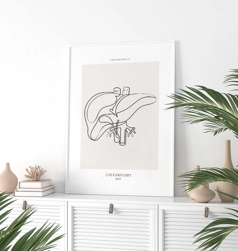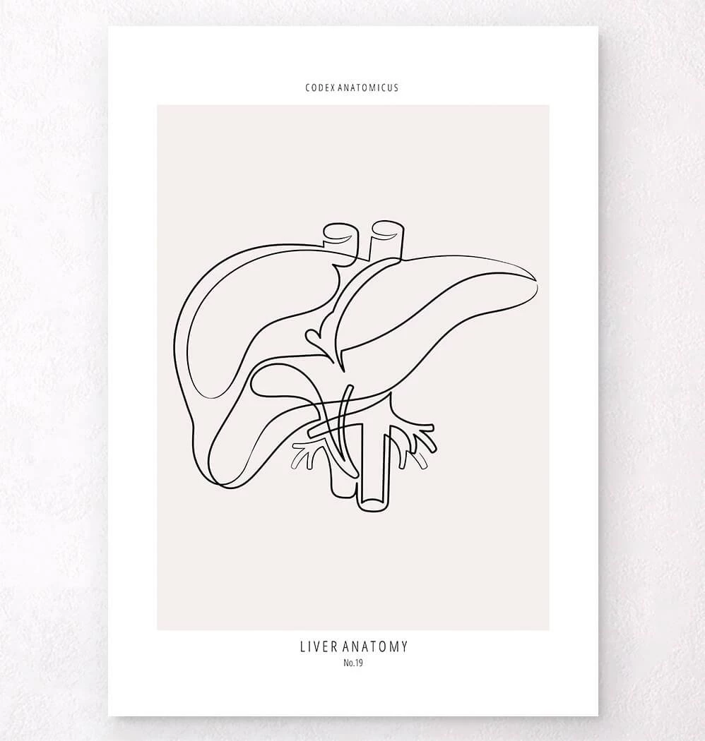 Line art illustration showing the anatomy of the liver. This premium art print is a perfect décor piece for a home, study space, or clinic. It’s also a great gift for hepatologists, gastroenterologists, and medical students in general.