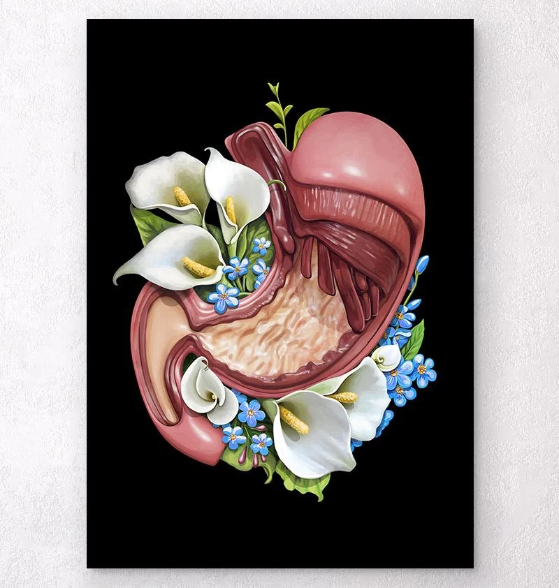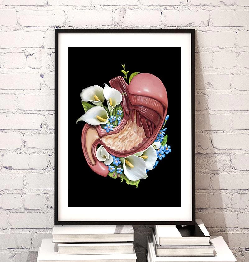 Also available on white and vintage backgrounds. This stomach anatomy art print is a wonderful addition to any interior and will make a perfect gift for doctors, nurses, and medical students