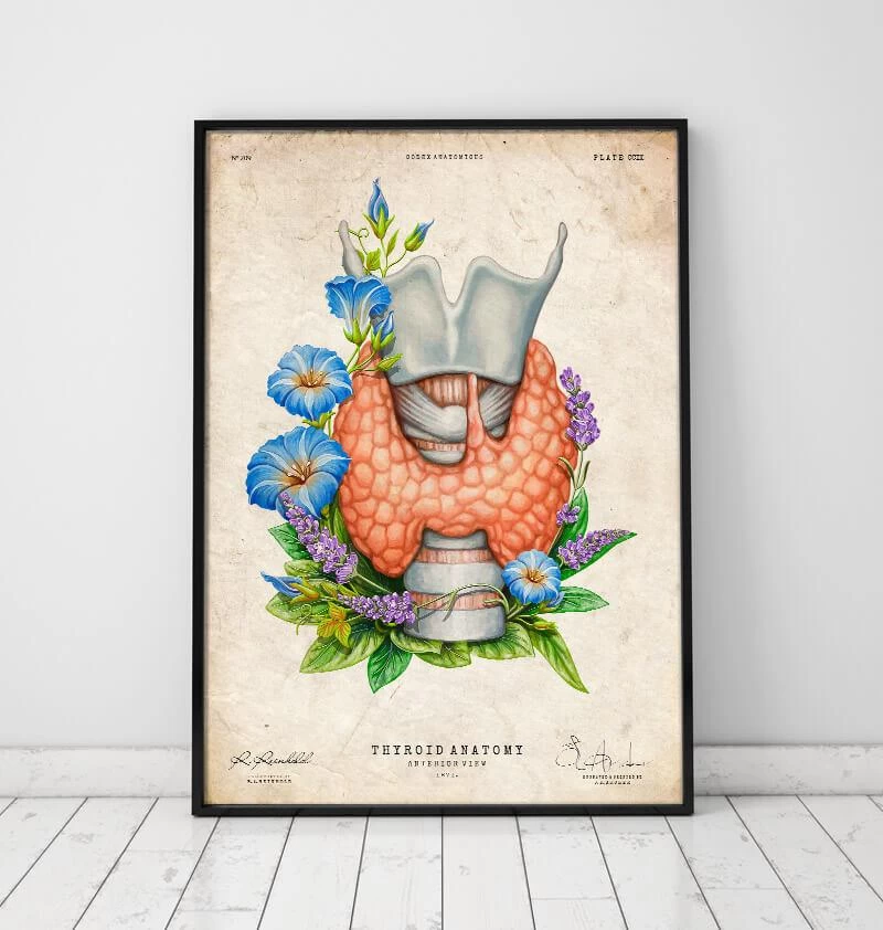 Also available on black and white backgrounds. This thyroid anatomy art print is a wonderful addition to any interior and will make a perfect gift for doctors, nurses, and medical students.