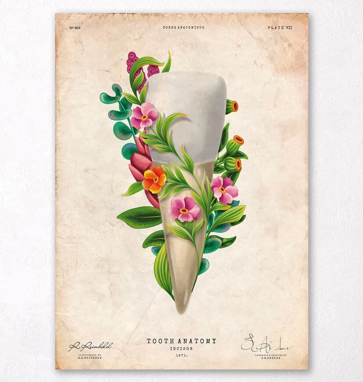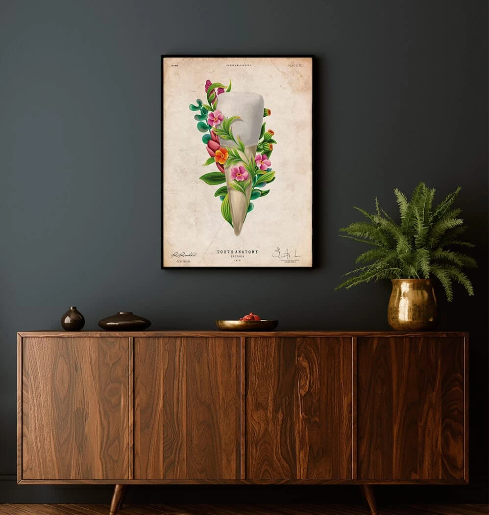 Also available onย blackย andย white backgrounds. This tooth anatomy art print is a wonderful addition to any interior and will make a perfect gift for gift for dentists, nurses, and dentistry students