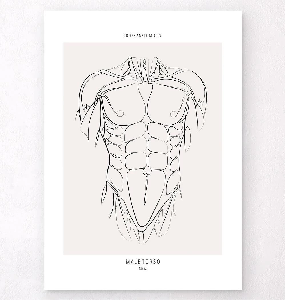 Line art featuring deltoid, pectoralis major, external obliques, and more. This premium art print is a perfect décor piece for a home, massage studio, or physiotherapy room. It’s also a great gift for health workers and medical students.