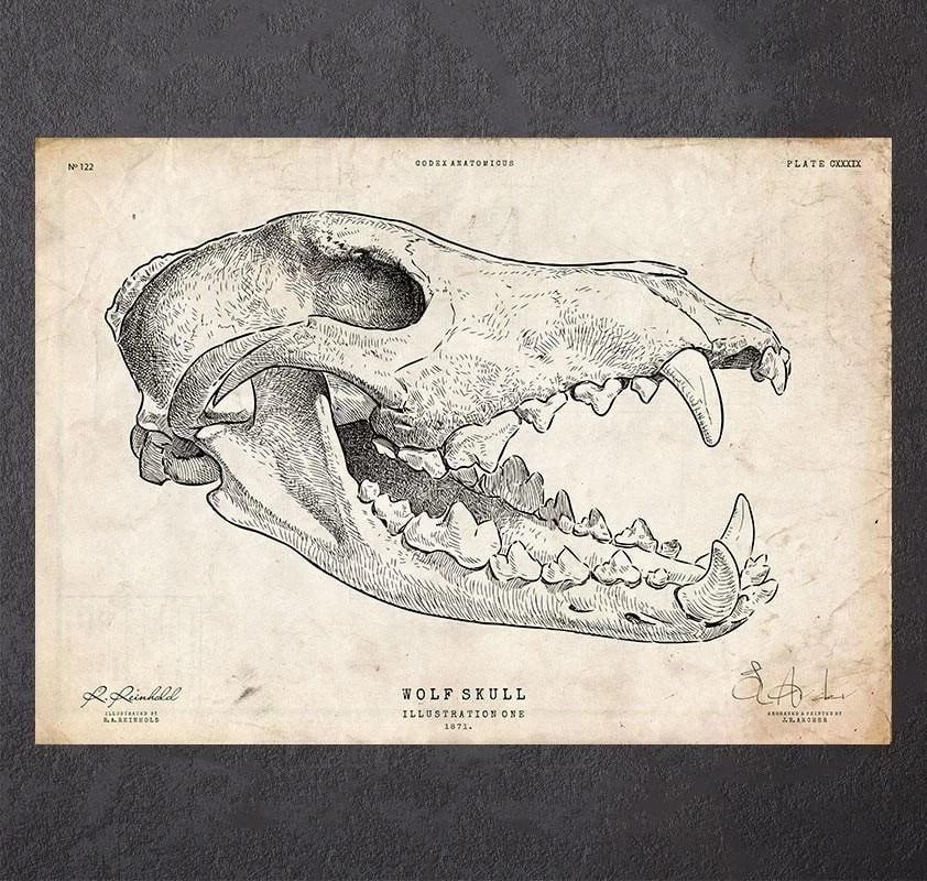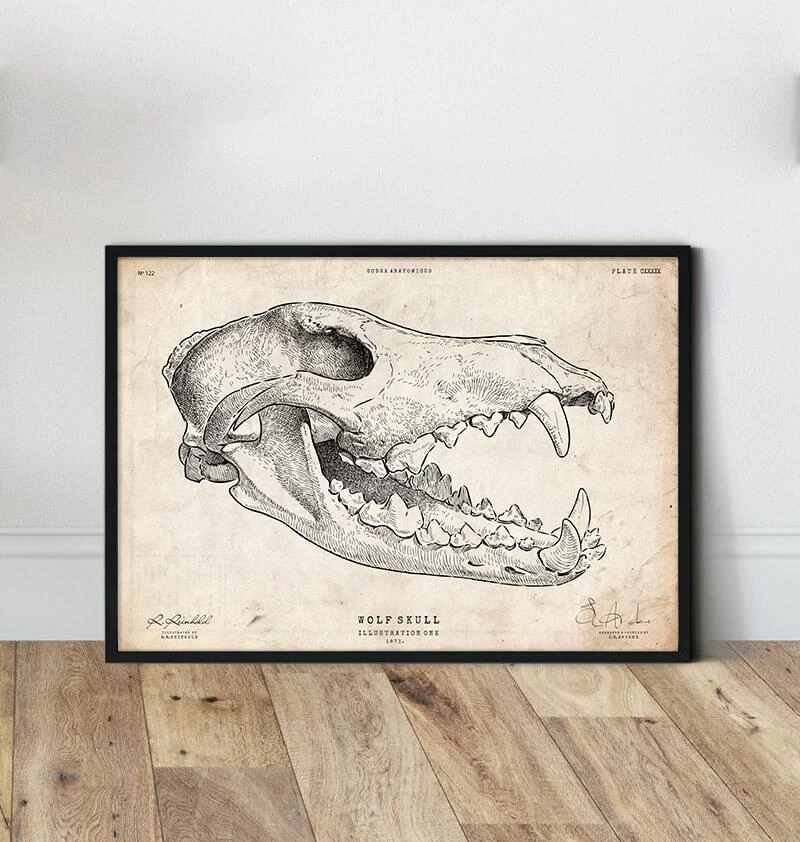 This wolf skull anatomy art print is a wonderful addition to any interior and will make a perfect gift for veterinaries